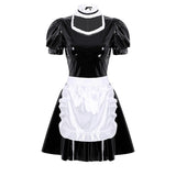 - Made of gorgeous shiny vegan wet-look fabric that's comfortable to wear, with a saucy removable apron and girly white ruffled trim.