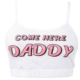 - Quality pink printing on a sweet white crop top with text says "Come Here Daddy" across the chest in cute barbie font.