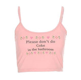 - With the words, "Please Don't Do Coke In The Bathroom" across the chest with retro florals.