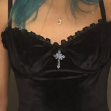 - Featuring a gorgeous supportive cupped bralette that is ultra flattering, dual lace trimmed hemline, beautiful spaghetti straps, with a stunning metal cross embellishment on the chest!
