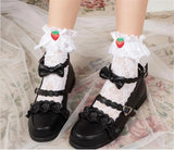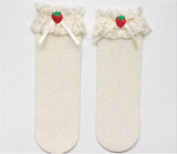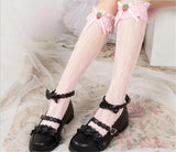 - These stunning lace knee-high stockings feature elegant ruffles on the top with a strawberry embellished silk ribbon for ultimate dainty berry babe vibes.