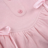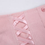 - A beautiful light pink corduroy skirt with lace corsetry, buttons, and a layered cake skirt design with beautiful doily lace trim.