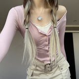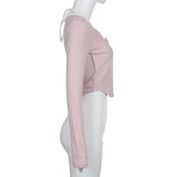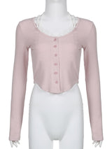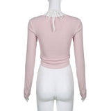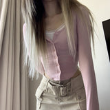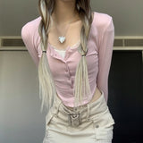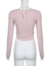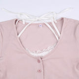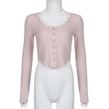 - The pink color and lace detailing give off a nymphette vibe, while the button-up front and cozy long sleeves add a touch of sophistication.