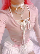 - The Pink Button Up Lace Cardigan is the perfect addition to your angelcore or fairycore wardrobe.