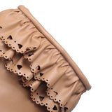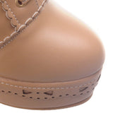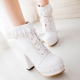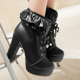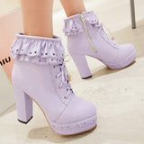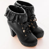 - A beautifully detailed pair of sweet booties with dainty lace ruffled trim, flattering square heel, and lovely laces!