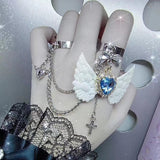 - This set includes multiple rings with chains attached, featuring cute glossy bat wings, crystal embellishments, and silver hardware.