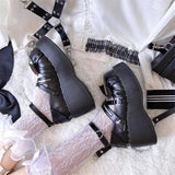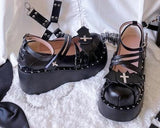 - A stunning gothic devil inspired bat wing platform wedge shoe with strappy buckles!