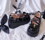- Featuring devil / bat wings and a metal cross, with a 3 inch platform heel that is super easy and comfortable to walk in!