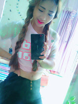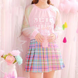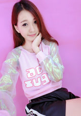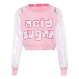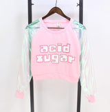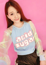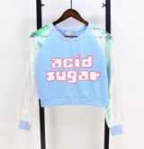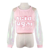 - This holographic crop top sweater has subtle rainbow reflective long sleeves, kawaii writing that says "acid sugar", and a flattering loosely cropped fit that looks good on almost any body shape!