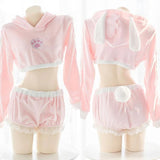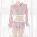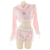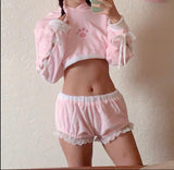 - Includes a snuggle warm pastel pink bunny eared hoodie in a cropped sweatshirt style with a hand embrodiered paw print on the front!