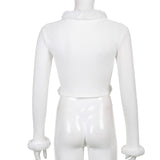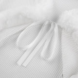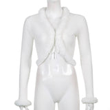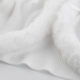 - The white color and classic knit design give off a nymphette vibe, while the vegan fur trim adds a touch of luxury and glamour.