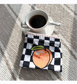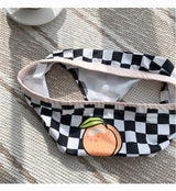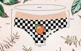 - Featuring a bright black & white checkerboard pattern all over with a juicy ripe peach on the front with a matching peach waist band - what's not to love?