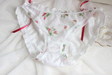 - These sweet ruffled strawberry patterned undies features adorable strawberries and a ruffled lace trim with sweet red ribbons!