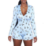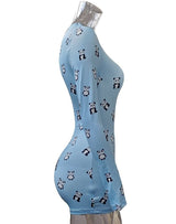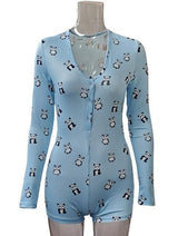 - With cute little button snaps along the chest, and a sweet panda print on a light baby blue backdrop!