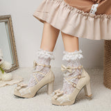 - Elegant Design: Crafted with delicate lace, these high heels feature a graceful ruffle detail and multiple bow accents, making them perfect for special occasions or just brightening up your day.