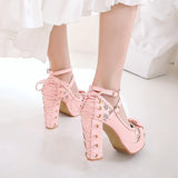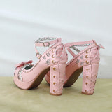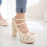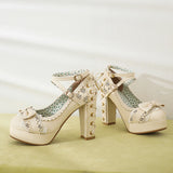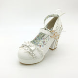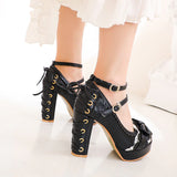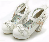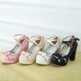 - A beautifully detailed pair of sweet kawaii shoes with dainty lace trim, gorgeous bows, and a corsetted heel.
