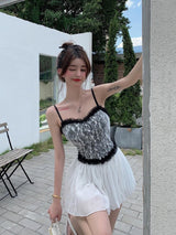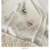 - Made of quality layered of knit & lace fabric with silky ribbons, pearl button details, dainty spaghetti straps, bows and a stunning ruffled lace trim!