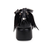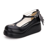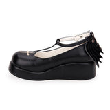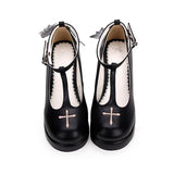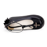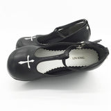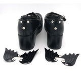 - A beautifully detailed pair of regal gothic shoes with a white cross on the toe and removable bat wings on the heels!