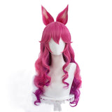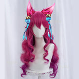 Bring your cosplay dreams to life with this “Spirit Blossom Ahri Cosplay Wig”! Perfect for fans of the ethereal and kawaii aesthetic, this vibrant wig captures Ahri’s enchanting style with a stunning blend of pink and purple hues. Paired with adorable matching blue bows featuring golden bells, this wig is designed to turn heads at any event.