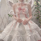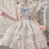 - With a lace-up front and silk chiffon ruffles & bows at the neckline, this angelic dress is perfect for bridal showers, hot summer days, or wanting to feel elegant and youthful.